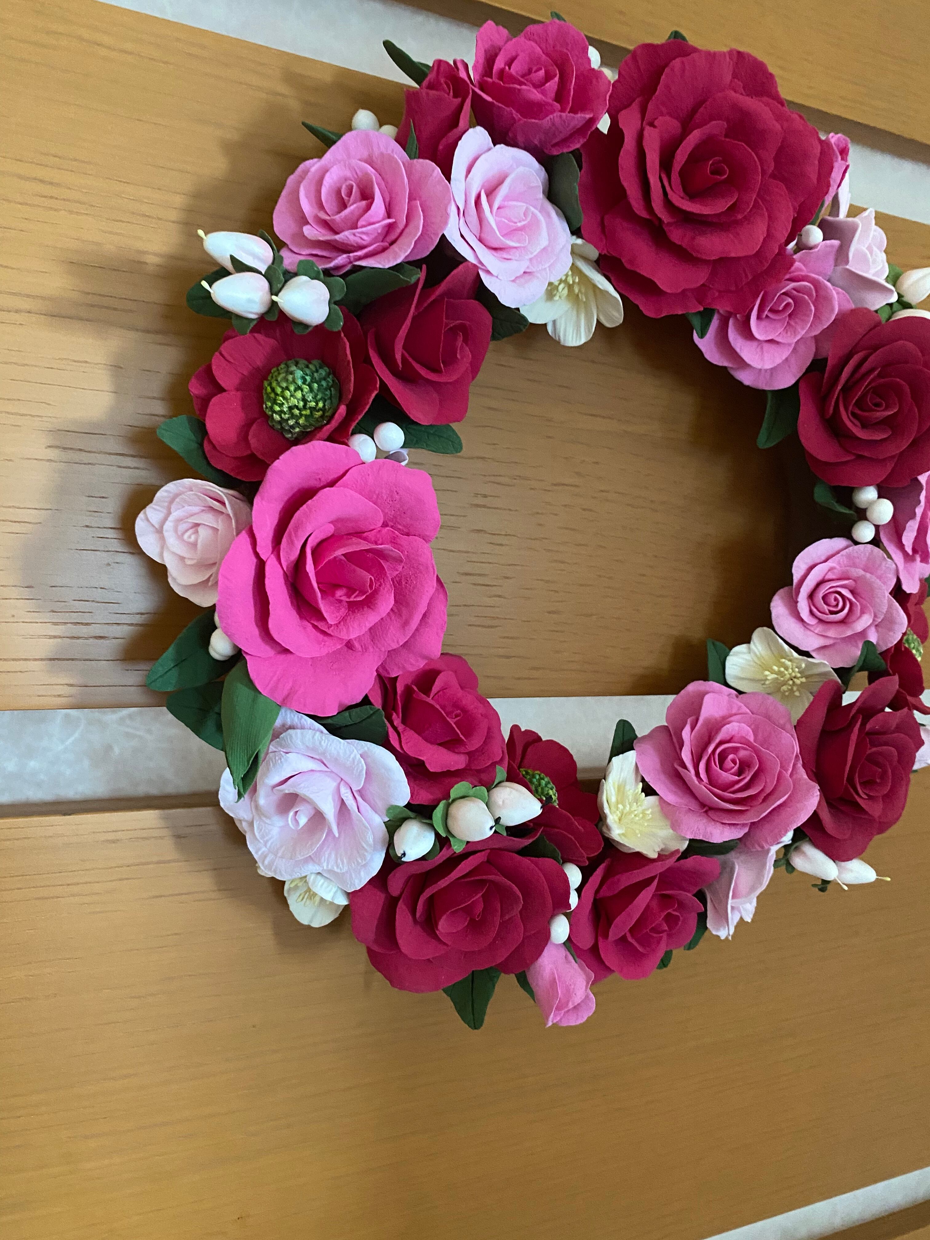 赤とピンクの薔薇の華やかなリースです。季節を問わず、お部屋を明るく照らしてくれます。